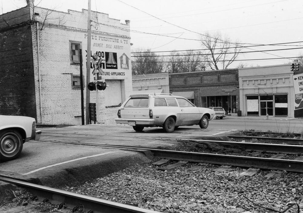 Old railroad crossing and traffic signal in Acworth, Georgia, circa 1980, Save Acworth History Foundation collection, SC/A/003, Kennesaw State University Archives.