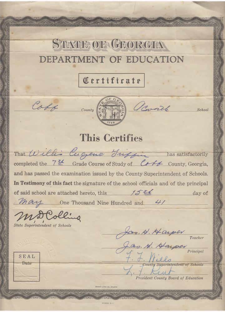 Seventh grade certificate presented to Willis Eugene Griffin, Georgia Department of Education, May 15, 1941