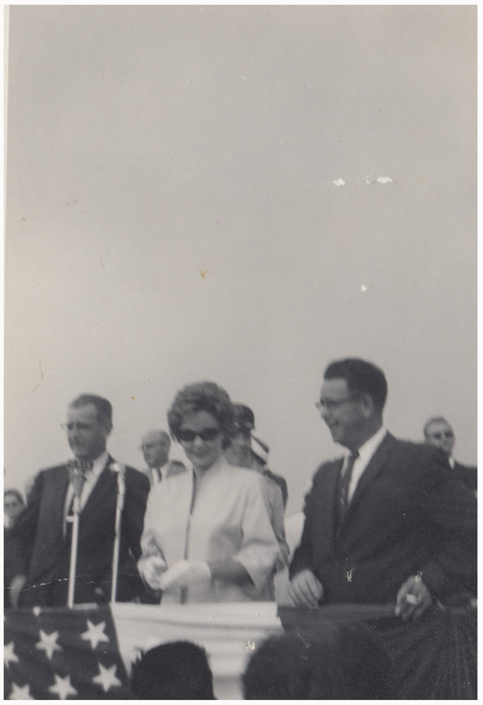 Cobb County, Georgia, Commissioner Herbert Clay McCollum, Actress Susan Hayward, and unidentified person at the opening of McCollum Aiport (Cobb County International Airport), September 4, 1960, Larry Brantley Thompson Collection, 2020, Kennesaw State University