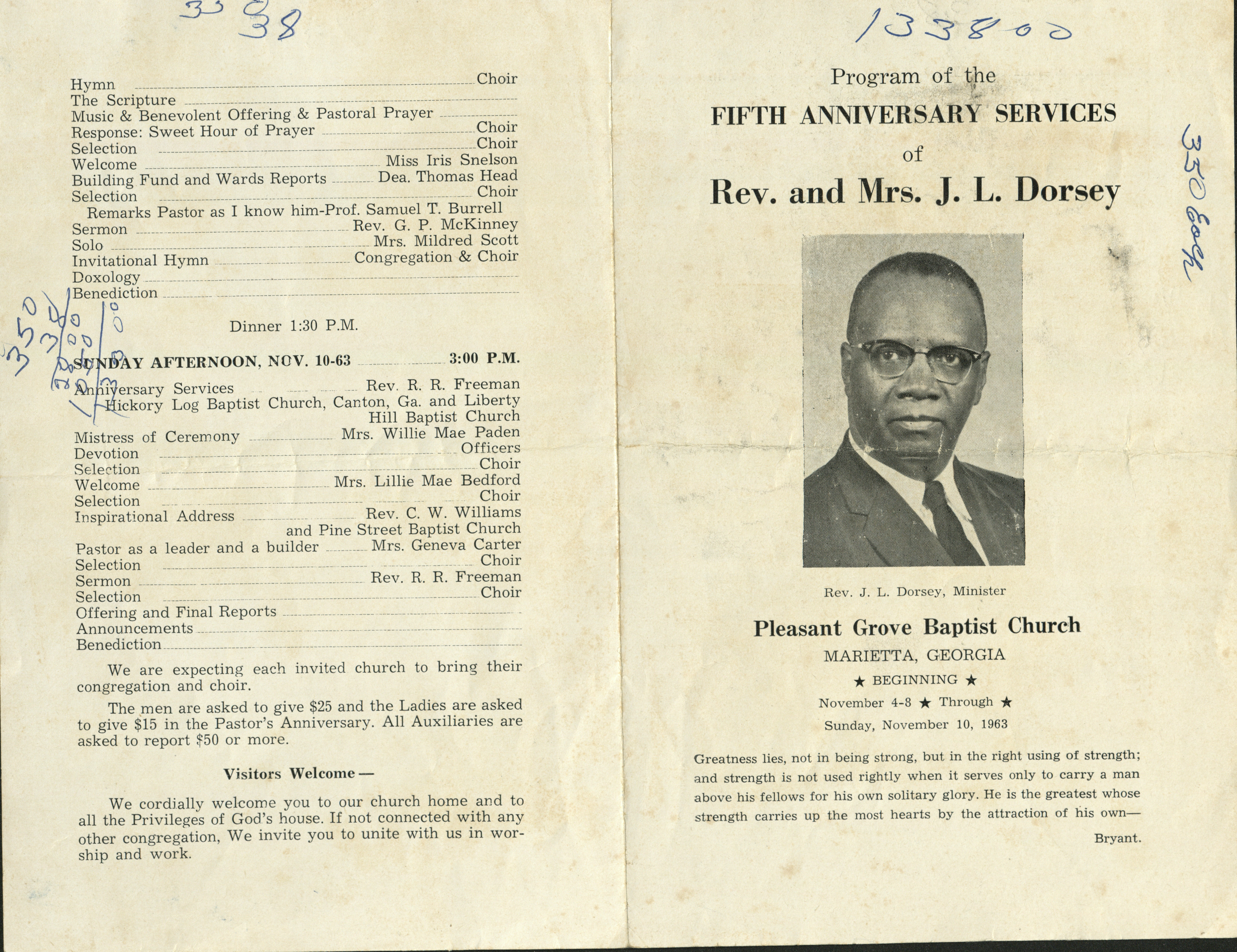 Front and back covers of the fifth pastoral anniversary program for Reverend and Mrs. J.L. Dorsey. Reverend Dorsey served as pastor of Pleasant Grove Missionary Baptist Church from 1959 until his death in 1975.