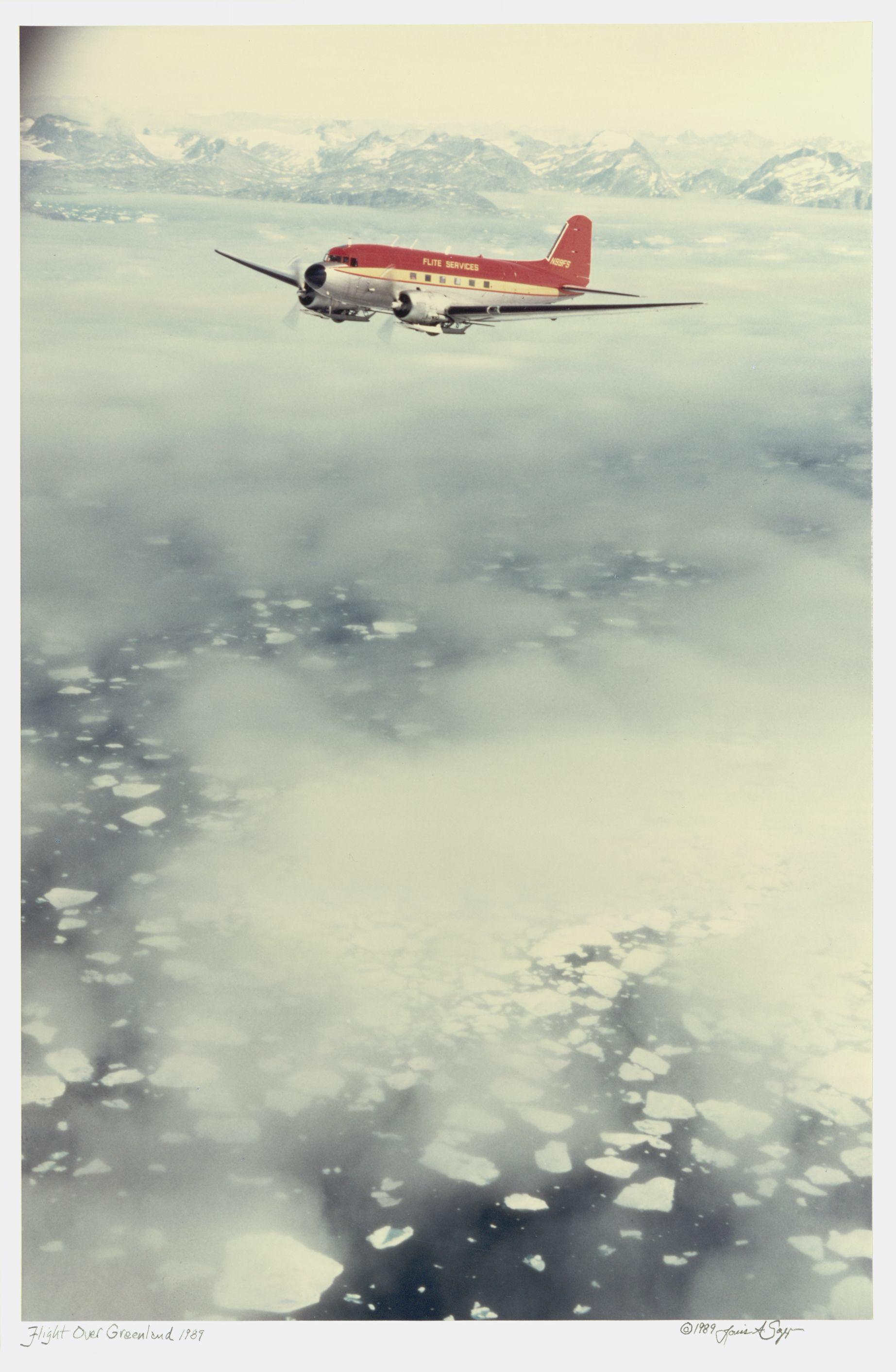 Color photographic print (Dye Imbibition [?]; 14 1/2 x 18 1/4 in. with cardboard backing). By Louis A. Sapienza. Image of DC-3 plane flying over the coast of Greenland. The DC-3 was used to transport the equipment needed for the expedition.