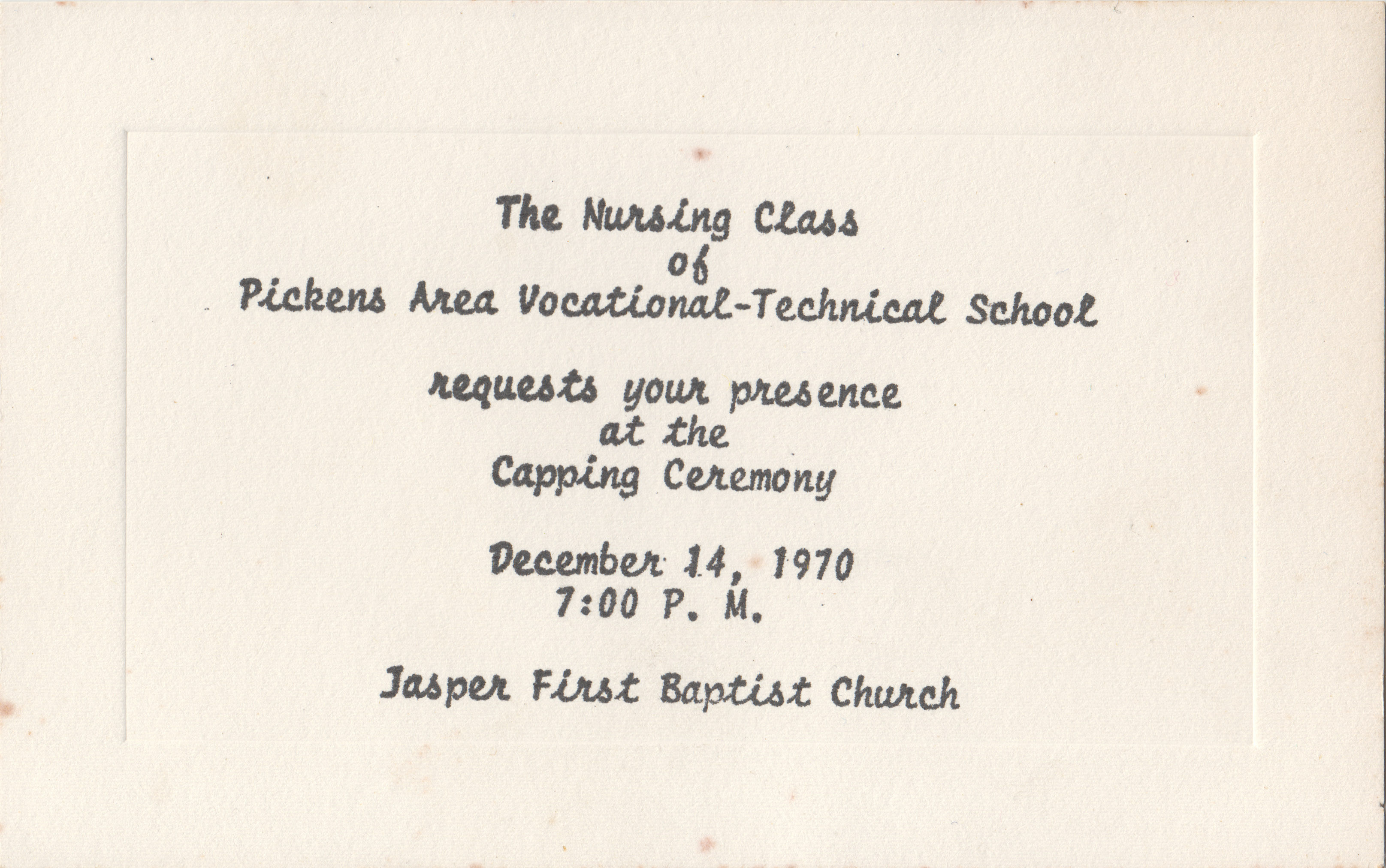 Nursing Class of Pickens Area Vocational-Technical School announcement, “Annie Hampton received from Jan Jackson Chattahoochee Tech,” December 14, 1970