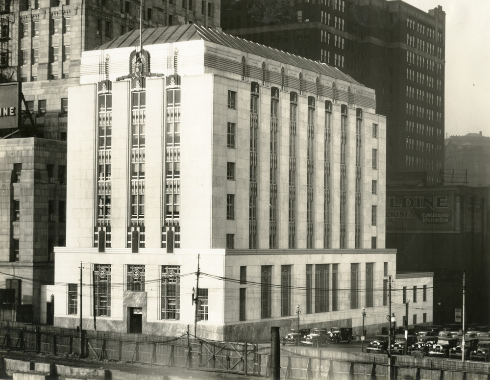 Photograph of Federal Reserve Bank, Pittsburg, Pennsylvania, December 26, 1931. Reverse reads: "Federal Reserve Bank, Pittsburgh, Pa. Walker & Weeks, Architects. Mellon-Stuart Const. Co., Contractors. White Cherokee Axed with Polished Creole Base."