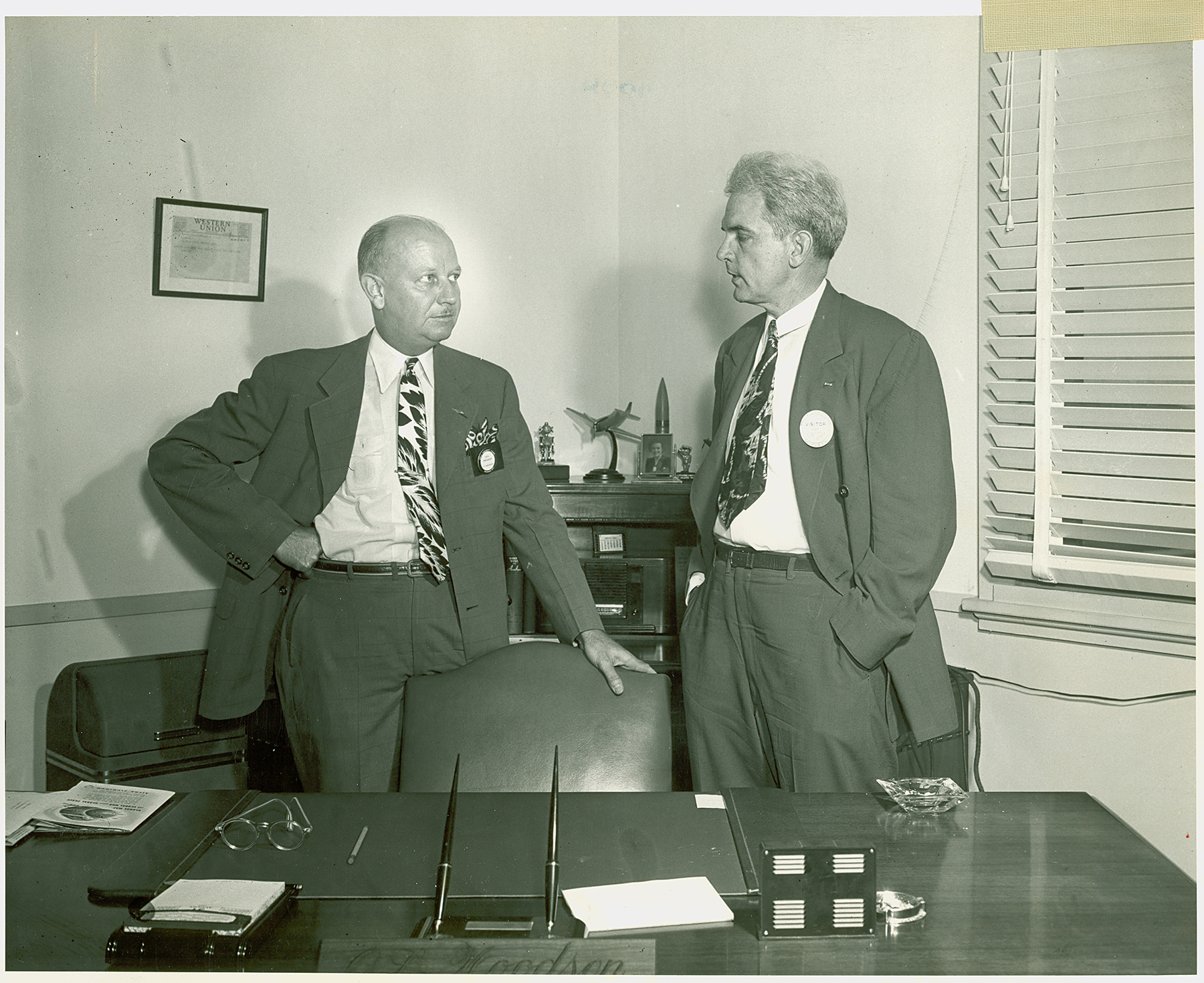 Omer L. Woodson, plant manager, poses with Florida Governor Spessard Holland in an office