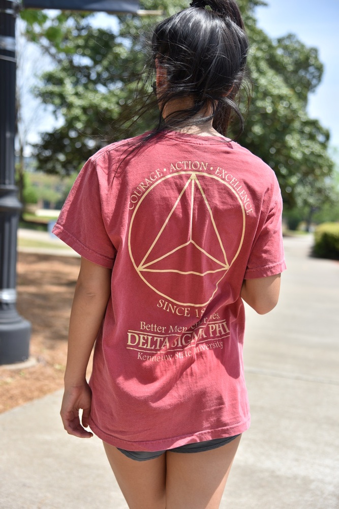 T-shirt for 2017 Delta Sigma Phi fraternity fall rush. Front of shirt says "Delta Sigma Phi/Fall Rush 2017/Kennesaw State University." Back of shirt features fraternity logo and the words "Courage. Action. Excellence./Since 1899/Better Men. Better Lives./Delta Sigma Phi/Kennesaw State University."