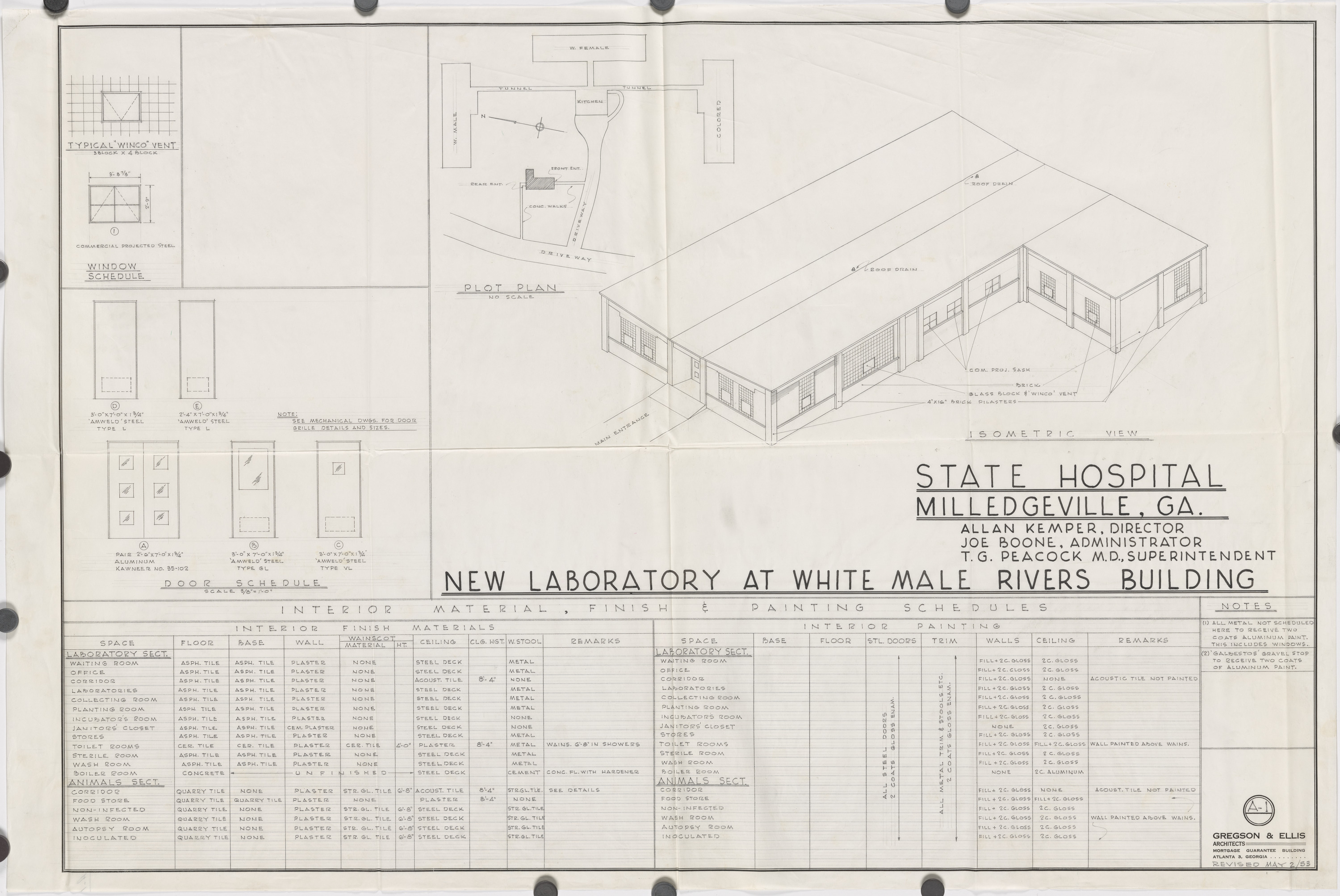 New Laboratory at the White Male Rivers Building, Milledgeville State Hospital. [Isometric view, plot plan, and schedules]