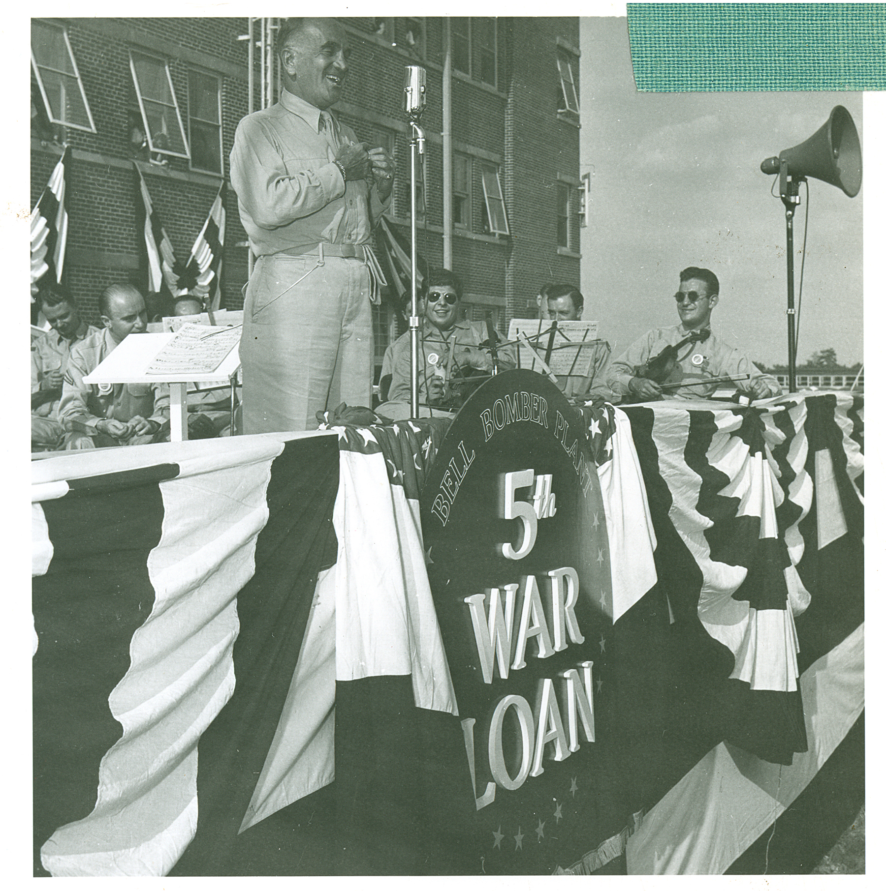 Speaker, possibly Al Jolson, at the Bell Bomber Plant 5th War Loan Rally.